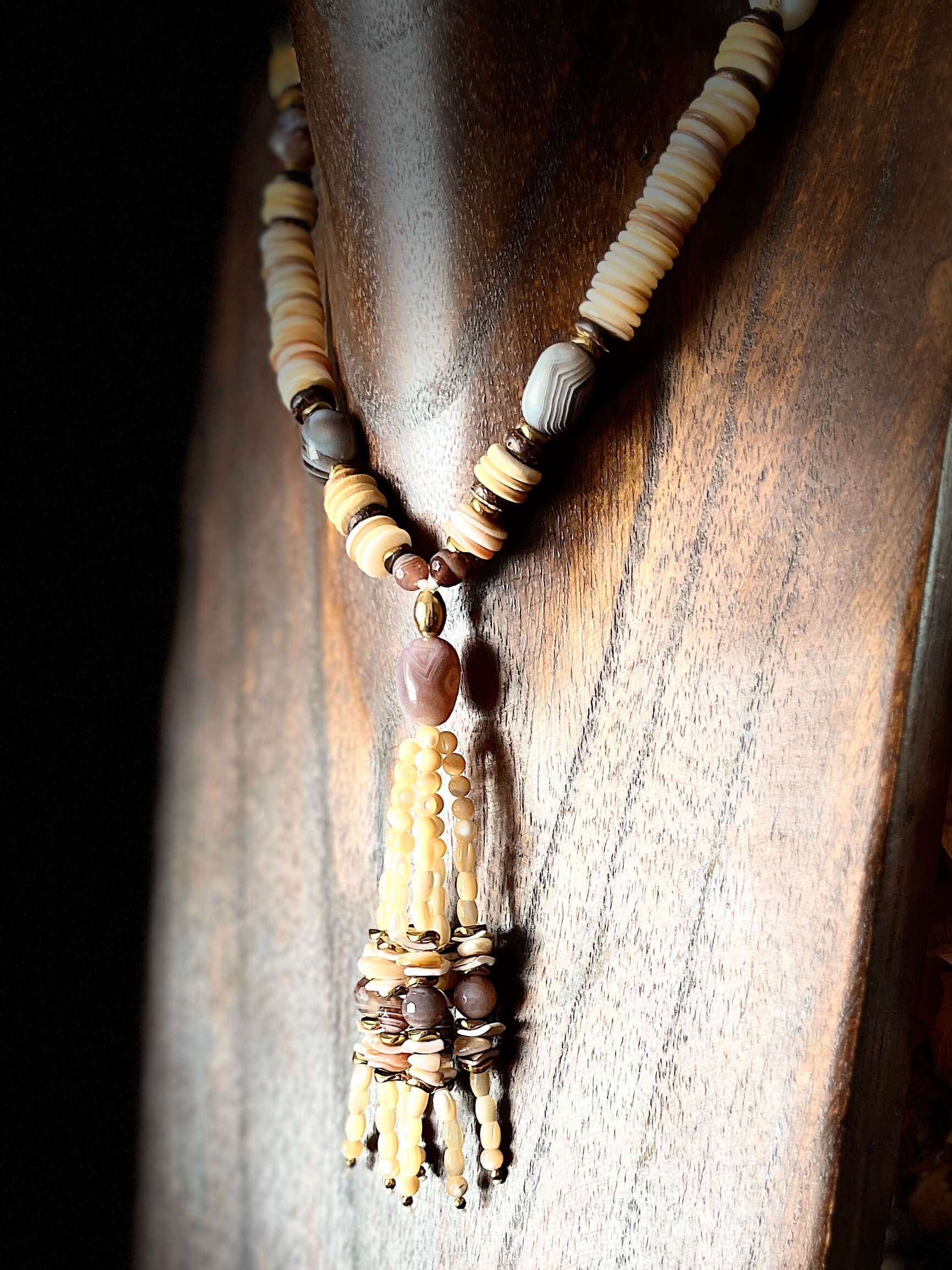 Collection très discrète mais puissante autour de l'agate du Botswana. Douce, féminine, captivante, vibrante. Vous y trouverez de l'agate du Botswana, de la nacre, du bois pétrifié, de la coco...... Le tout dans des tons naturels pastels, de rose poudré, taupe, crème, ivoire, beige...