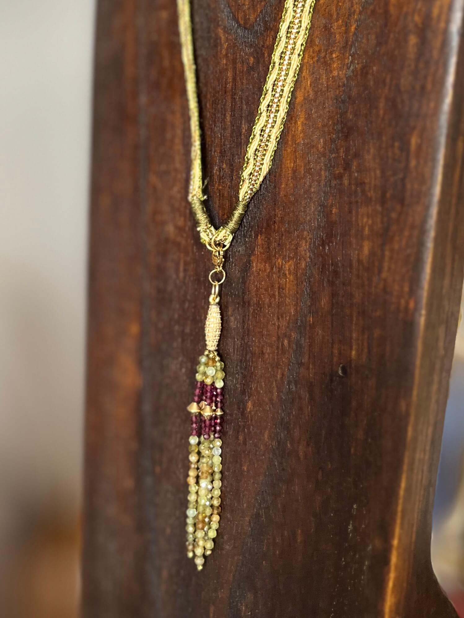 Au centre, un pompon de grenat vert et bordeaux révèle ses perles facettées, jouant avec la lumière comme de minuscules éclats d’âme.