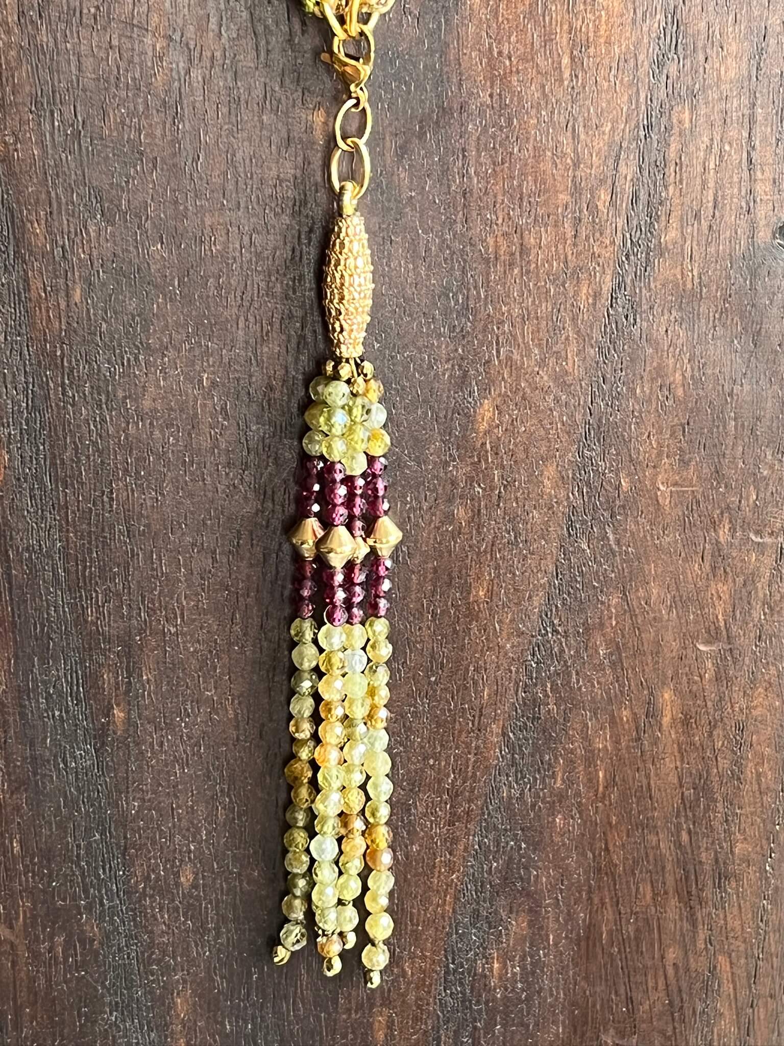 - Pompon entièrement fait à la main: perles facettées naturelles de grenat vert, grenat bordeaux et hématite.