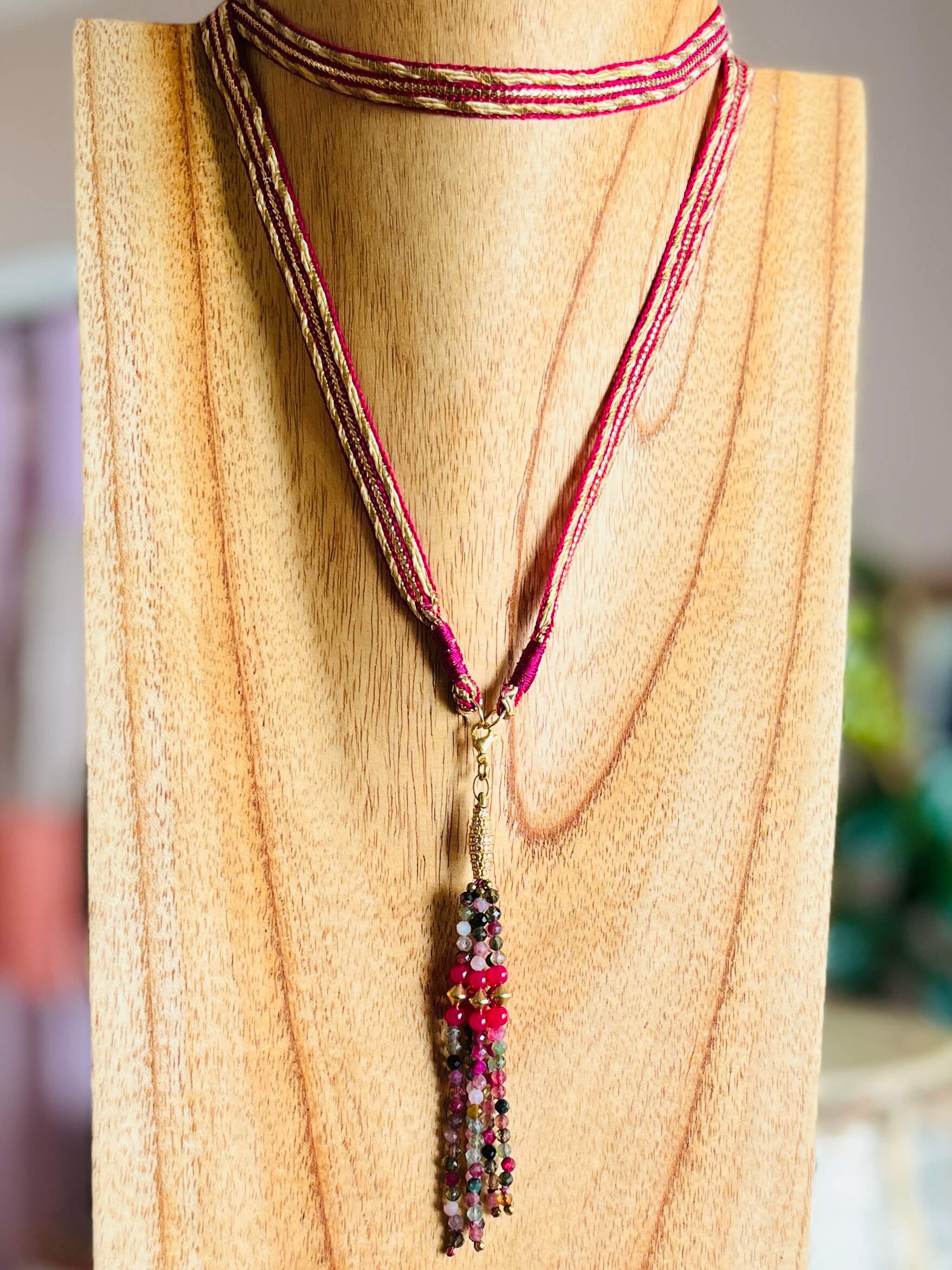Le ruban fuchsia et doré, d’une finesse unique, chiné dans une mercerie indienne à l'Ile Maurice, met en valeur un pompon délicat travaillé entièrement à la main. Il se compose de perles naturelles de tourmaline multicolore, de rubellite fuchsia, de composants en plaqué or 3 microns: il vient se poser délicatement au niveau du plexus solaire. Un jeu de couleurs chatoyantes qui apporte éclat, énergie et féminité.