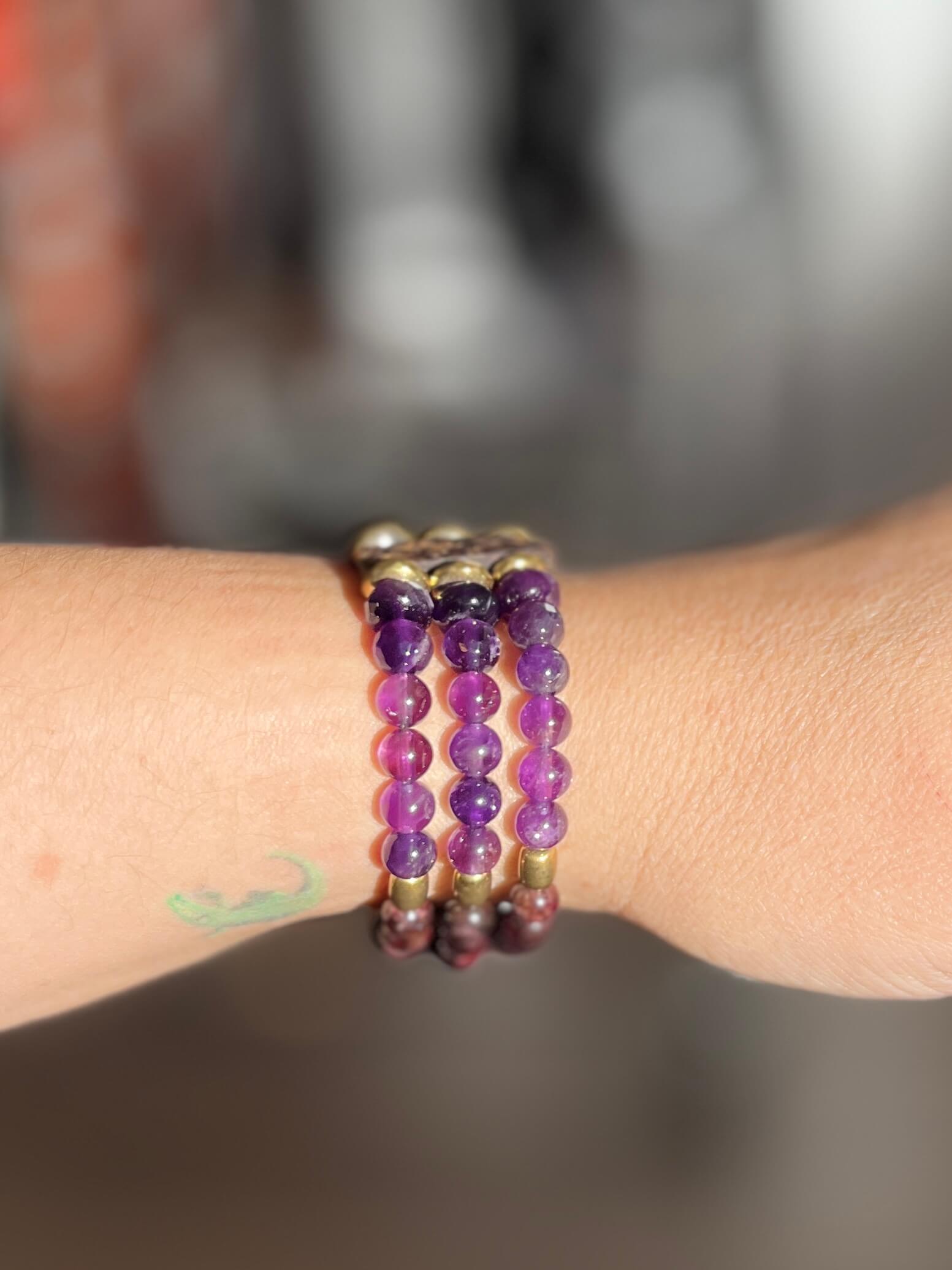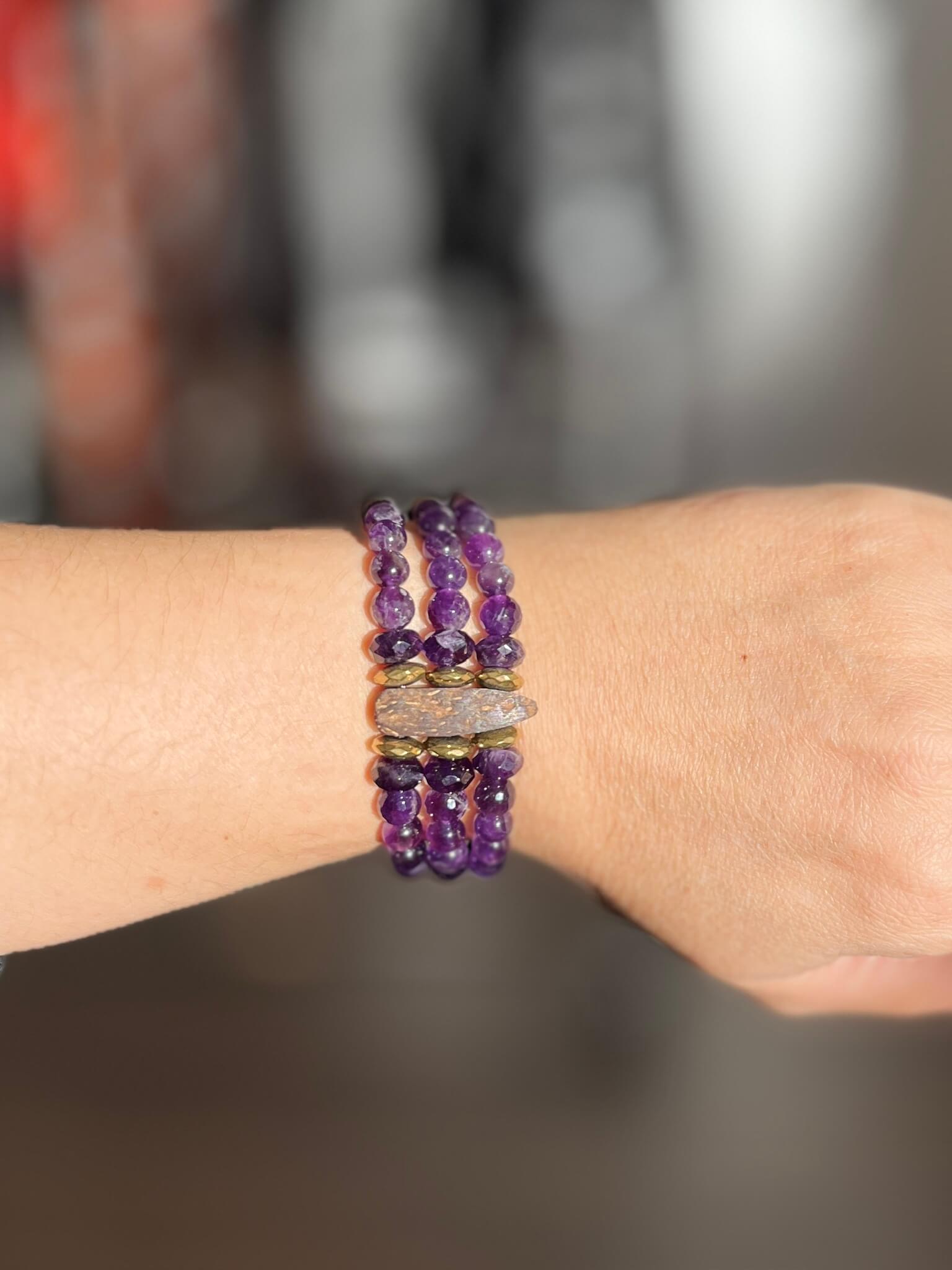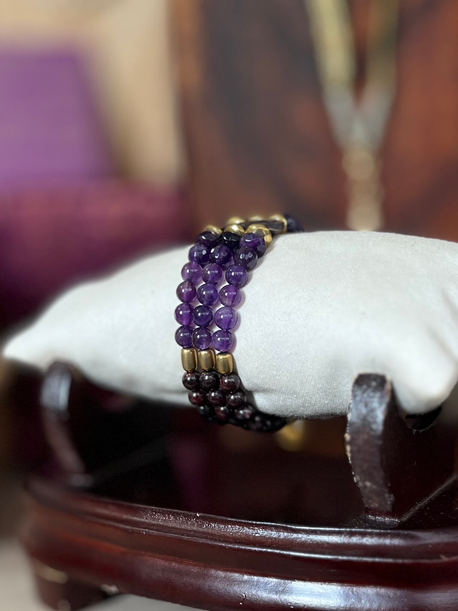 - Composées de 3 rangs de rondelles facettées d’améthyste, de rondelles facettées d’hématite dorée et de perles lisses de grenat rouge.