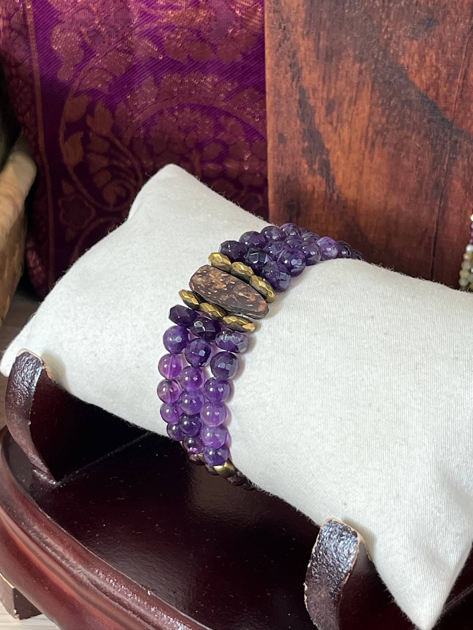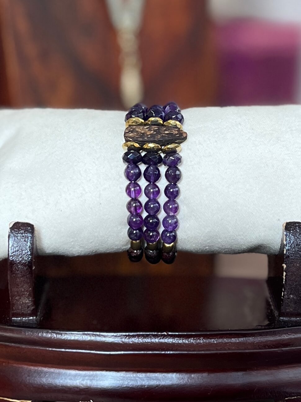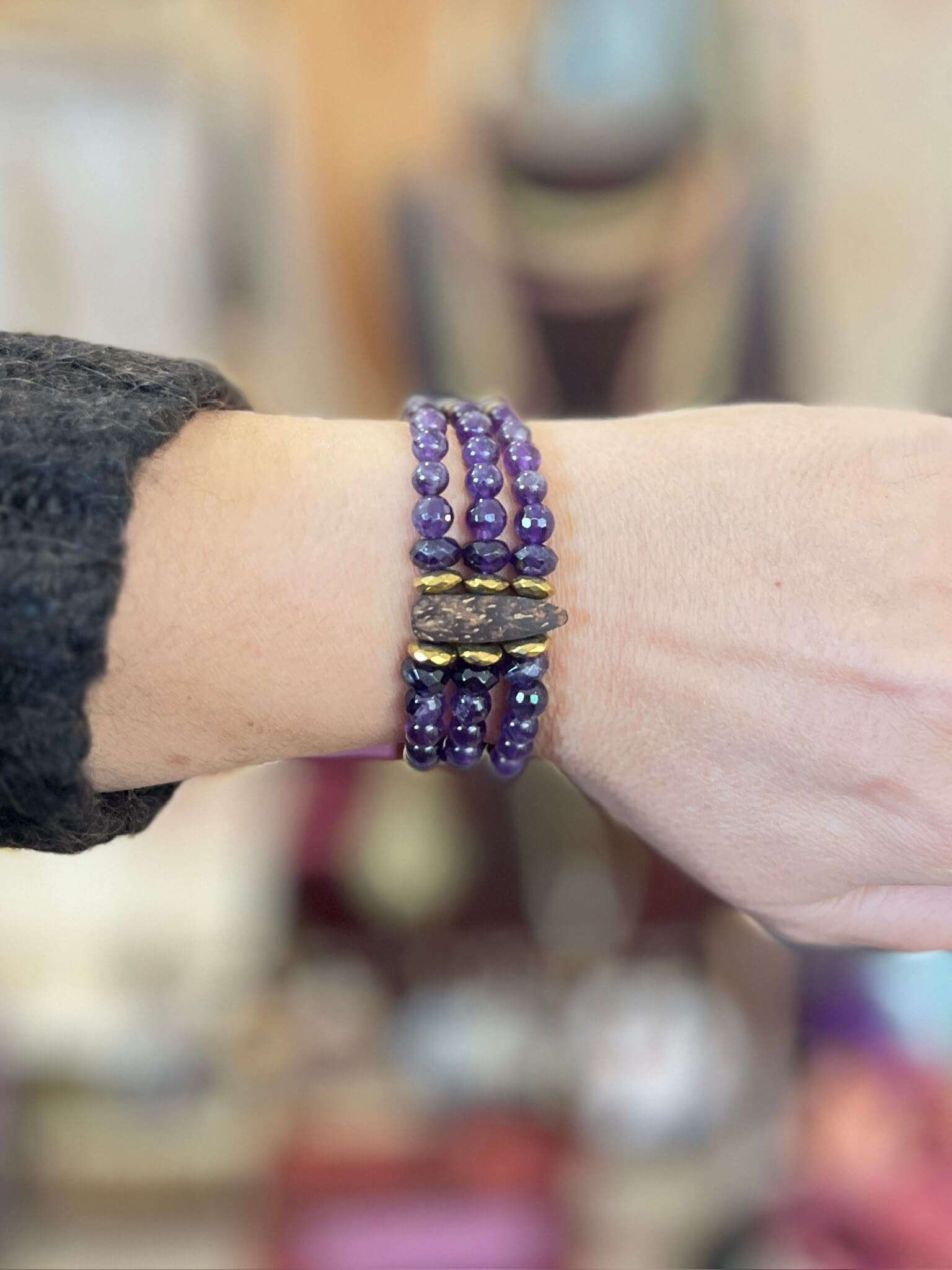 - Composées de 3 rangs de rondelles facettées d’améthyste, de rondelles facettées d’hématite dorée et de perles lisses de grenat rouge.