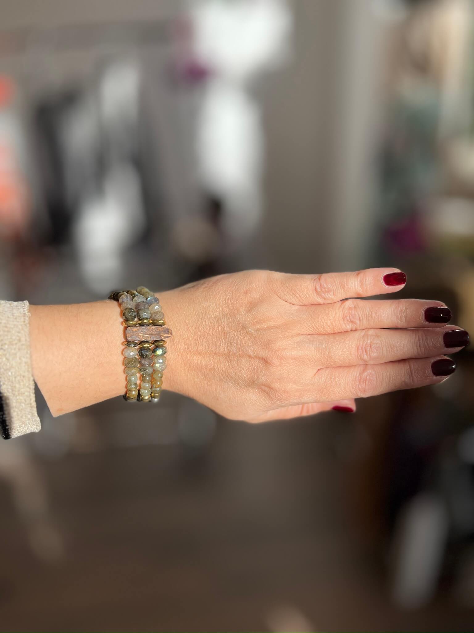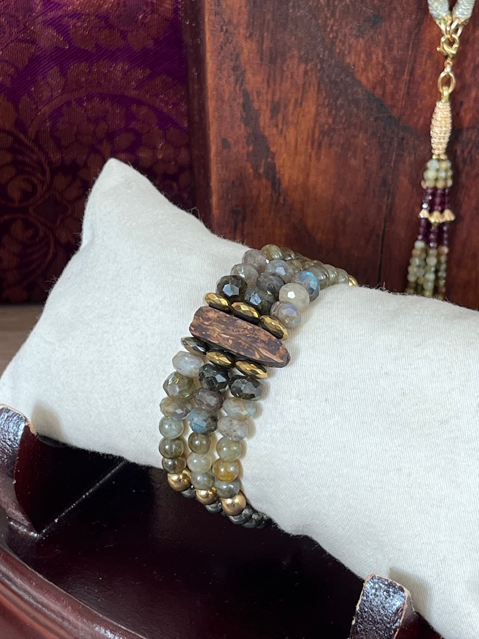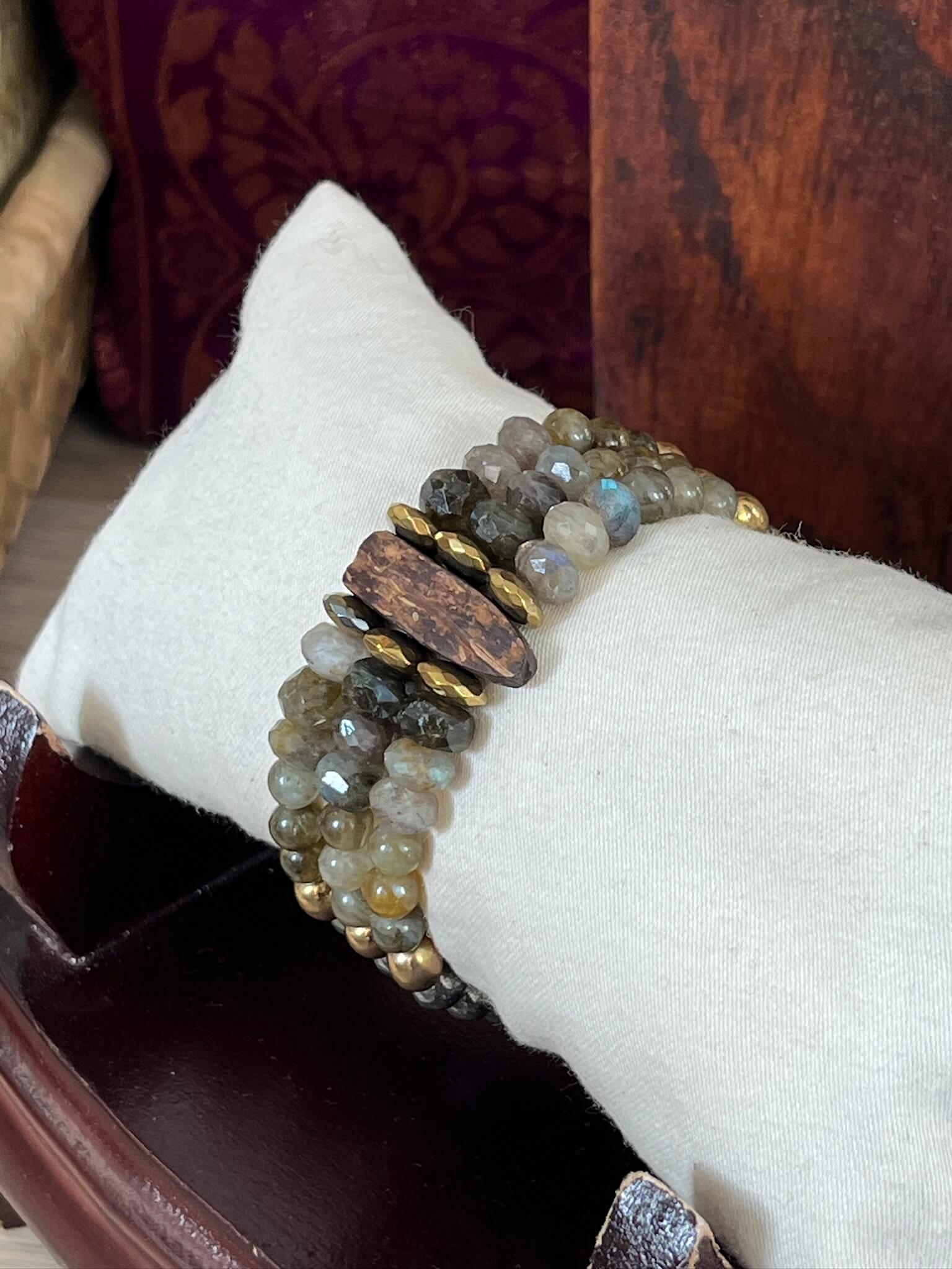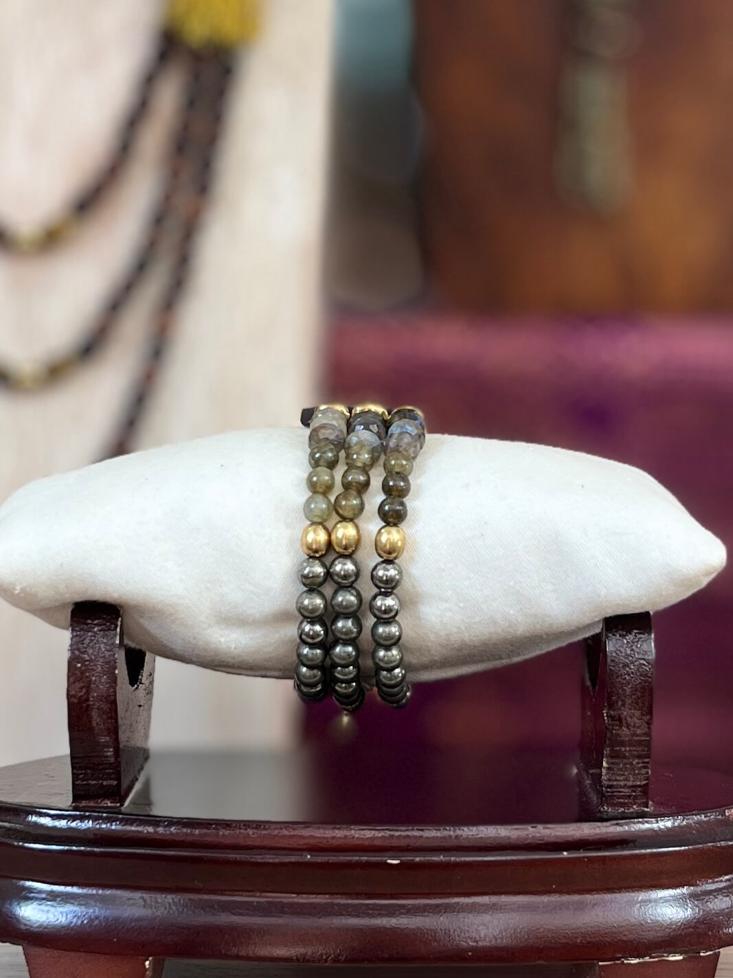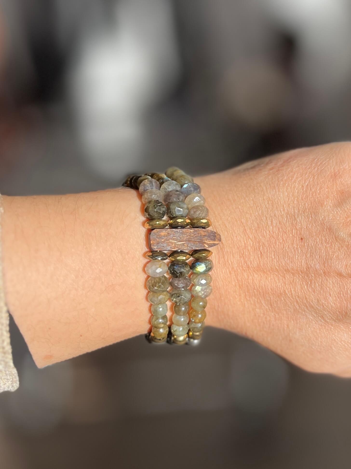- Composées de 3 rangs de perles de labradorite facettées et lisses, hématite et pyrite.