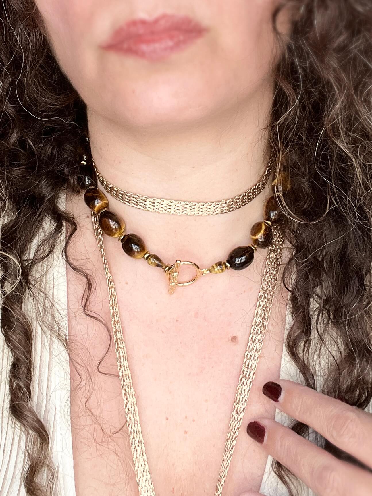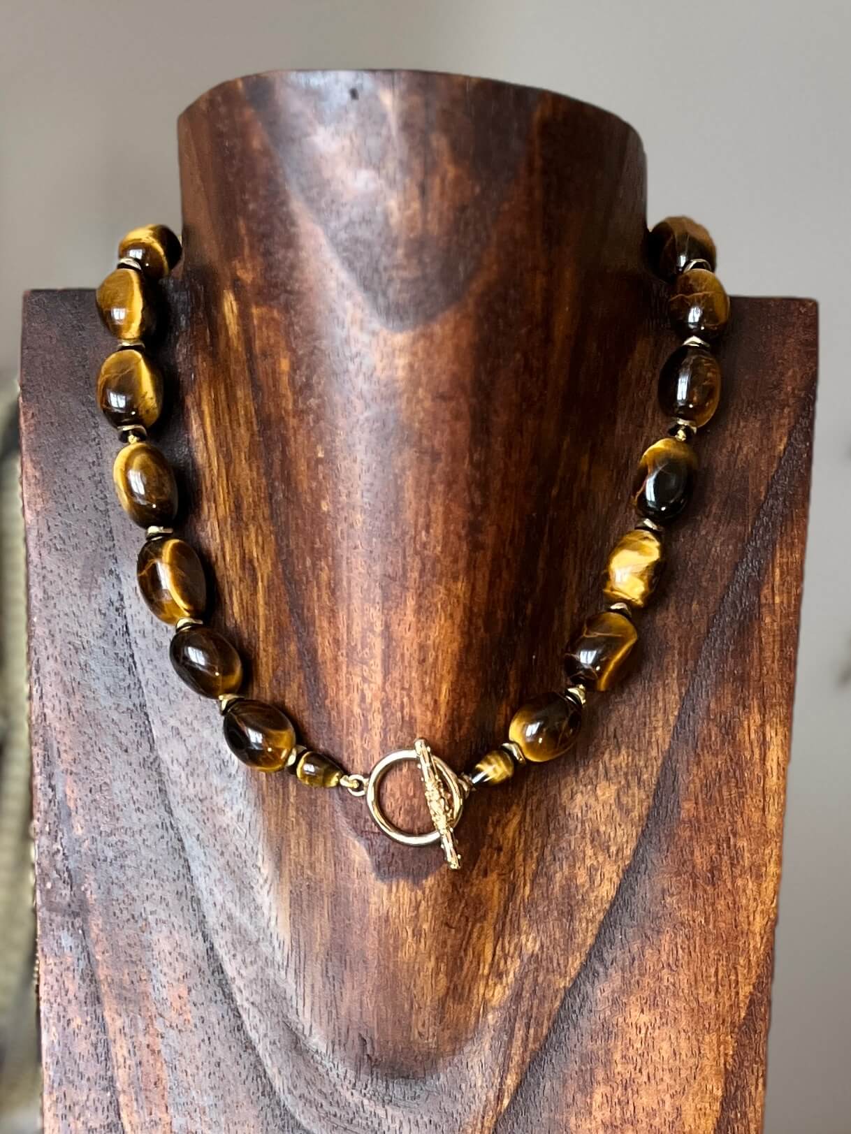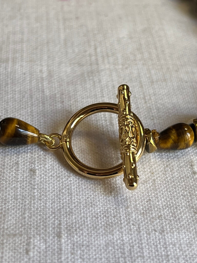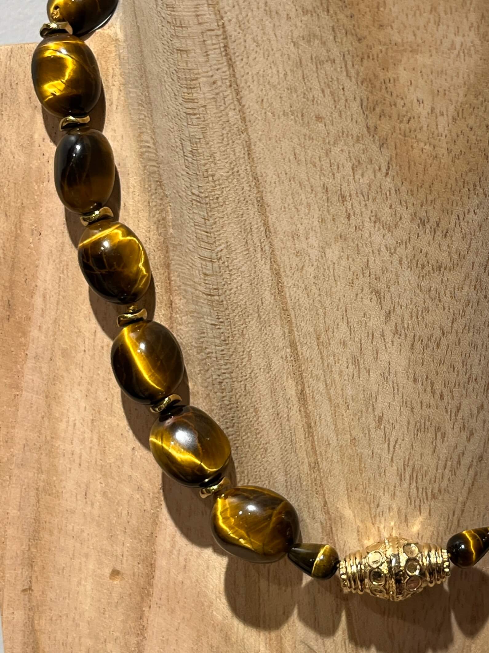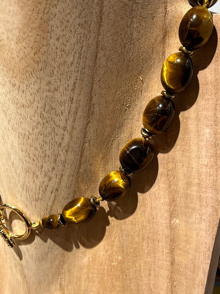 Ses galets dorés aux courbes douces, comme polis par l'océan indien, glissent délicatement le long du cou. Leur éclat chaleureux rencontre la profondeur flamboyante de l’Oeil de tigre, pierre-feu aux reflets fauves, symbole de puissance et de protection.