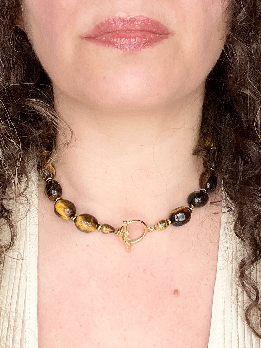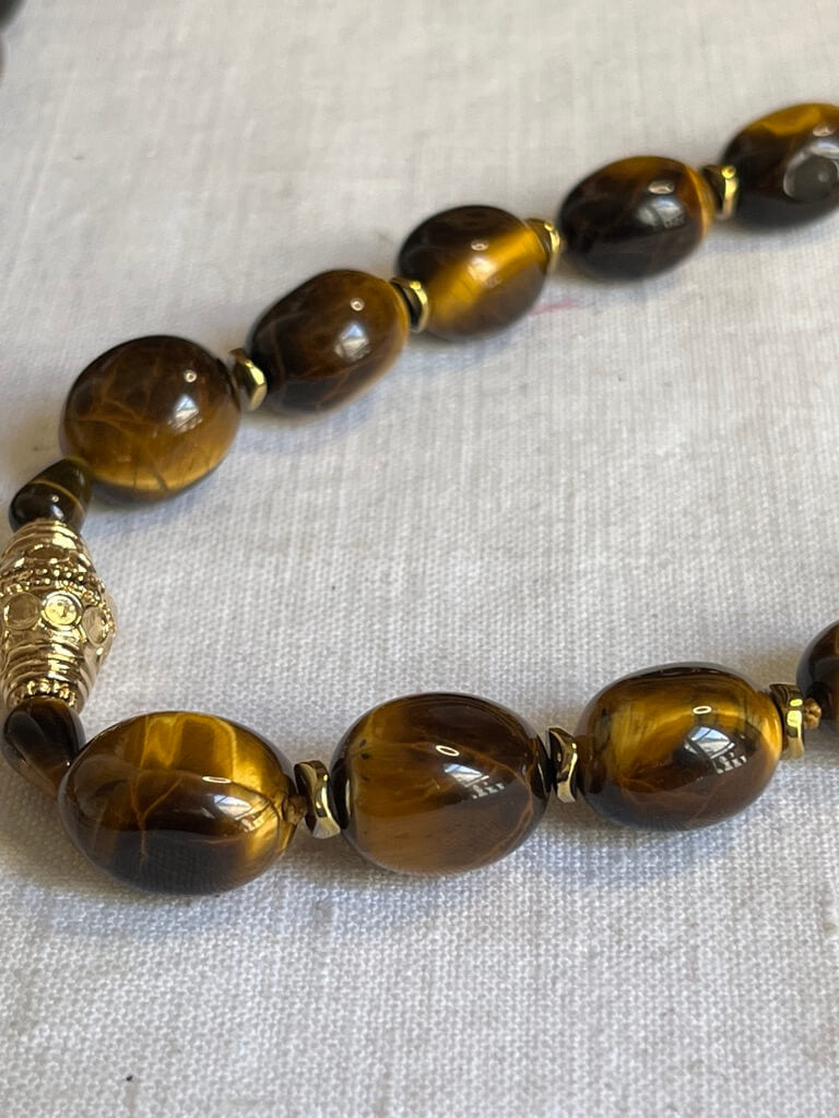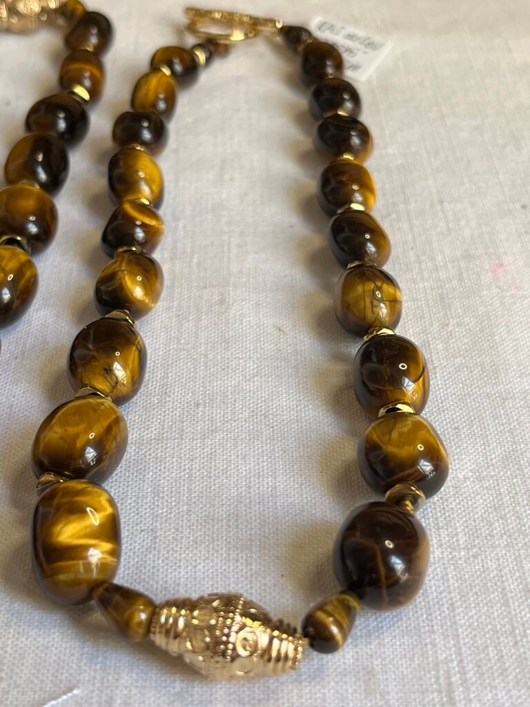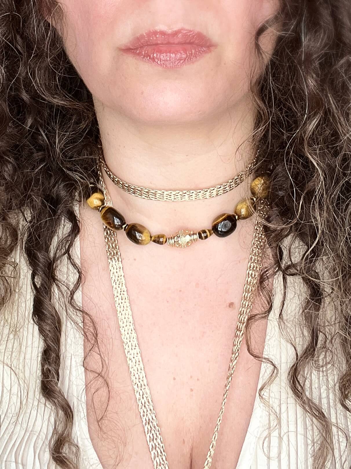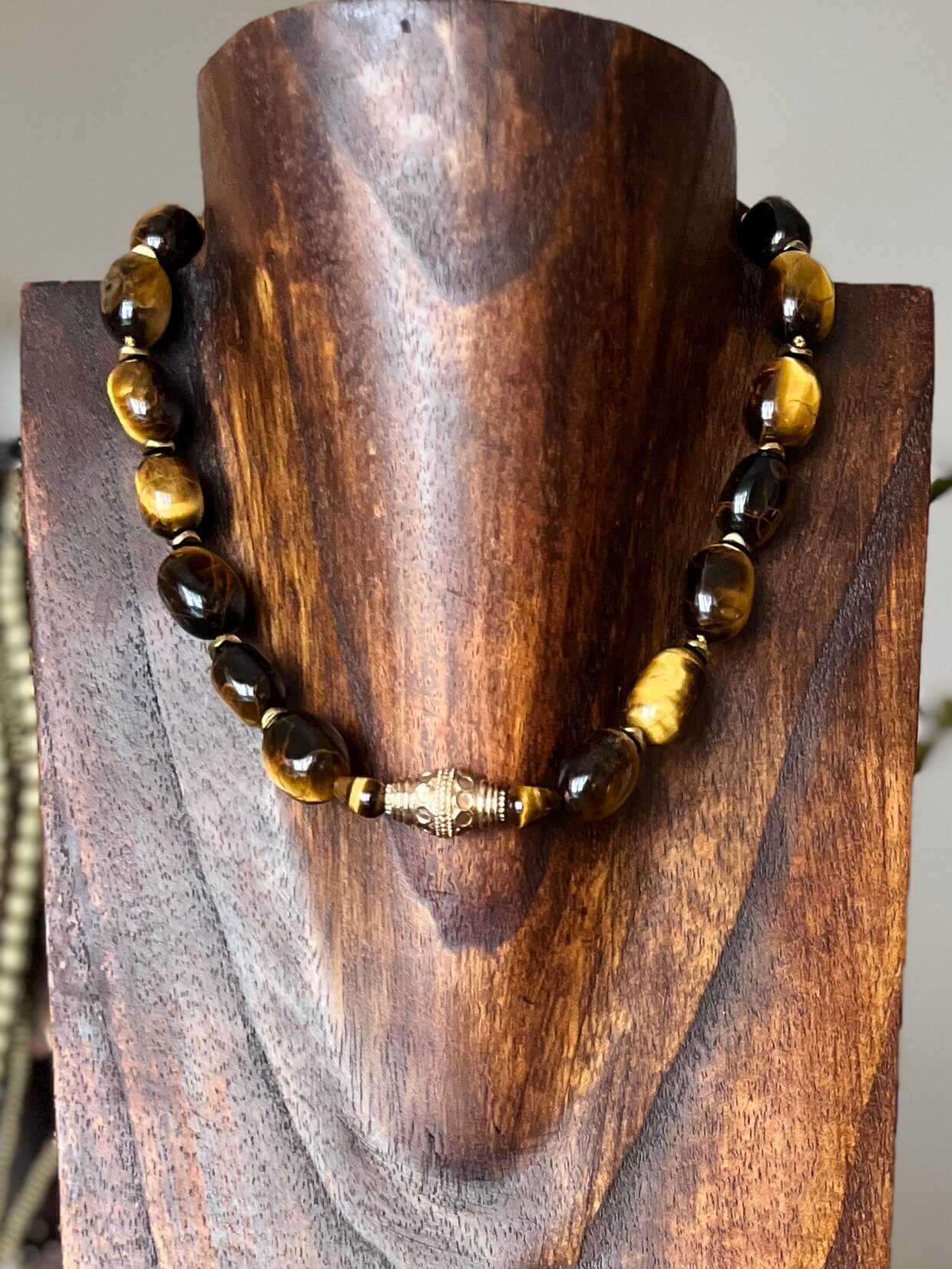 Ses galets dorés aux courbes douces, comme polis par l'océan indien, glissent délicatement le long du cou. Leur éclat chaleureux rencontre la profondeur flamboyante de l’Oeil de tigre, pierre-feu aux reflets fauves, symbole de puissance et de protection.